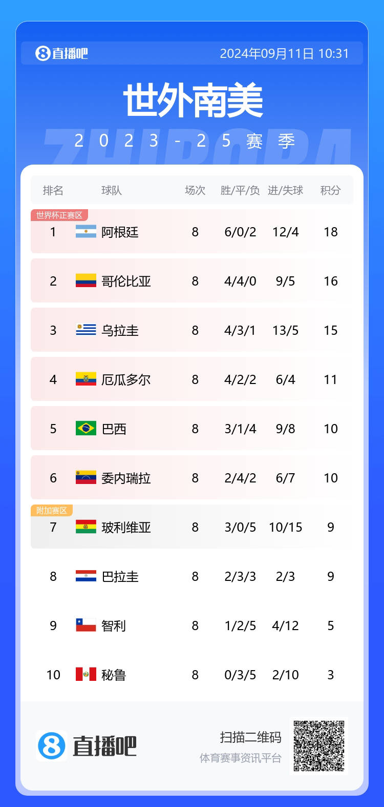 暴涨35分!玻利维亚4-0委内瑞拉&2-1智利 排名升6位但在南美仍垫底 2024-09-23 00:30:17 意甲 0 45 09月19日讯 FIFA最新一期国家队排名公布,玻利维亚积分暴涨35.2分,世界排名上升6位至第83,但在南美仍垫底。据官方统计,玻利维亚是本期世界排名更新中涨分最多的球队。9月的南美区世预赛,玻利维亚4-0大胜委内瑞拉、2-1击败智利。 #玻利维亚#委内瑞拉 # 上一篇:斯通斯:曾在曼城经历过低谷想过离队,但我决定留下最终成功了 # 下一篇:创近8年新低!FIFA最新排名:国足世界第91,亚洲第13 也许您对下面的内容还感兴趣: 形影不离!梅西晒与德保罗抵达巴兰基亚合照,中转前往委内瑞拉 自2008 年以来最接近奥运会胜利的亚洲球队:中国队对阵委内瑞拉队日本队对阵法国队 给您推荐相同类型的内容: 💪🏻米兰6-1狂胜萨索洛晋级意杯下一轮,丘库埃泽两球,亚伯拉罕传射 雷速体育12月4日讯 在刚刚结束... 沪媒:海港除了尽力留下奥斯卡,更需主动追求新老更替 12月4日讯 昨晚海港主场1-1战平光州后,2024年度的所有赛事已经结束。对于海港未来的前景,上观新闻发文进行了分析。沧海横流,方显英雄本色;亚冠赛场,才看得出一名外援的真正水平。这场对阵光州的亚冠精英... 卡佩罗:亚特兰大是意大利最具欧洲风格的球队,他们能争意甲冠军 12月3日讯卡佩罗接受采访时高度评价亚特兰大,称其为意大利最具欧洲风格的球队,并看好他们争夺意甲冠军。评价亚特兰大的整体实力,卡佩罗说:“所有意大利球队中最具欧洲风格的球队,加斯佩里尼是意大利和欧洲最出色... 克洛普邀请滕哈赫?荷兰足球专家:莱比锡在关注滕哈赫 12月3日讯 据talkSPORT报道,荷兰足球专家范德克兰表示,莱比锡可能邀请滕哈赫执教。克洛普将于1月1日正式上任红牛集团足球发展主管,但他面临着艰巨的任务,因为前利物浦助教林德斯执教的萨尔茨堡联赛5... 场面被动!海港队上半场控球率仅为40%,射门次数3-8落后 12月3日讯亚冠精英联赛第六轮,上海海港上半场0-1落后光州。数据统计显示,海港队控球率仅39%,射门次数3-8落后。控球率方面,海港仅为40%,光州控球率为60%。射门方面,海港3次射门1次射正,光州8... 留言0 评论 ◎欢迎参与讨论,请在这里发表您的看法、交流您的观点。 昵称* 邮箱* 网址 内容* 取消回复